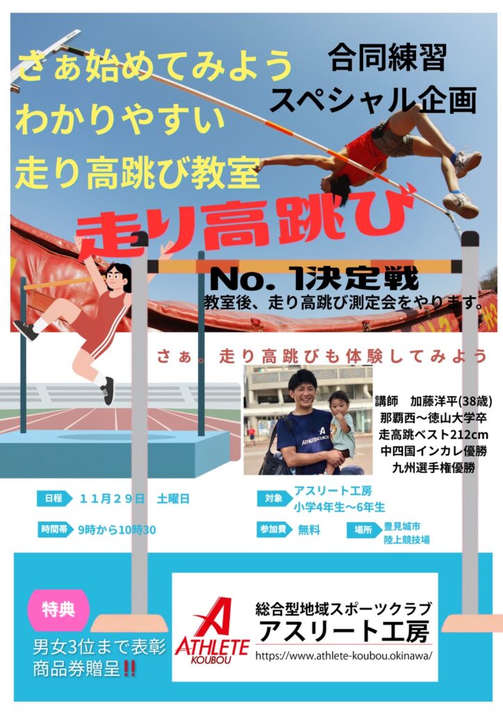 走り高跳びNO1決定戦&走り高跳び教室 news 2025.11.21 走り高跳びNO1決定戦&走り高跳びクリニック 11月29日土曜日の合同練習時に 走り高跳び教室&走り高跳び測定会を実施します。 ※小学校4年生~6年生対象 ※小学校低学年は通常のかけっこ教室を行います。 走り高跳びの講師は2m13㎝の記録を持つ 加藤洋平コーチが指導します。 いろんなスポーツを体験して 子ども達の可能性を見出すイベントです。 1人でも多くの参加者の参加をお待ちしています。